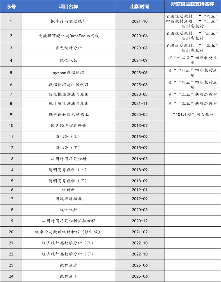 (3)锚定四新,全力推进专业教材建设。围绕大数据、人工智能等产业的发展需求,以专业为依托组建统计学、数据科学、应用数学等教材编写团队,设立高质量教材出版资助计划,推动专业核心课程、应用技术课程的教材建设,出版教材24部。其中,“十二五”普通高等教育本科国家级规划教材1部,“101计划”核心教材1部,浙江省本科院校“十三五”形态教材5部,浙江省普通本科高校“十四五”新文科重点教材、新工科重点教材各1部。学院牵头获批浙江省教材建设研究中心(大数据专业教材研究基地,2022)。