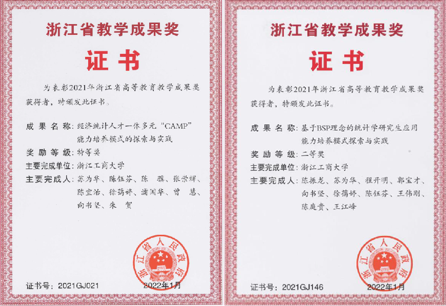 统计学入选首批国家特色专业(2008),经济统计学、应用统计学是国家一流本科专业建设点,经济统计学入选浙江省重点专业(2003)、“十二五”优势专业(2012)、浙江省“十三五”优势专业(2016)。在校友会发布2023中国大学一流专业排名中,应用统计学专业获评A+、经济统计学专业获评A类。