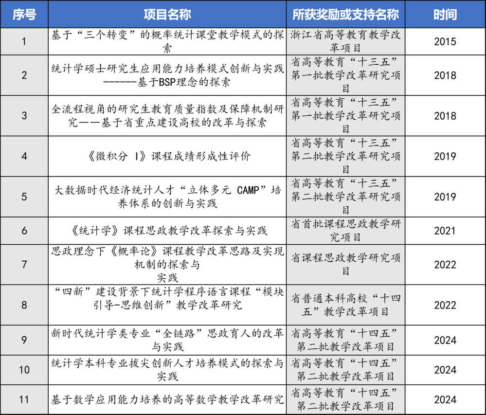 (5)加强教学改革探索,凝练教学成果。学院积极挖掘教育教学改革的成效与特色,注重教学改革与教学研究,加强课题申报、实施、成果培育与总结全过程管理,积极实施有组织的教学改革和教学研究项目培育,全方位鼓励教师团队开展课堂教学方法、课程建设、实践平台、学科竞赛、人才培养模式等方面的改革,获浙江省高等教育“十三五”教学改革研究项目4项,浙江省教学成果奖6项。